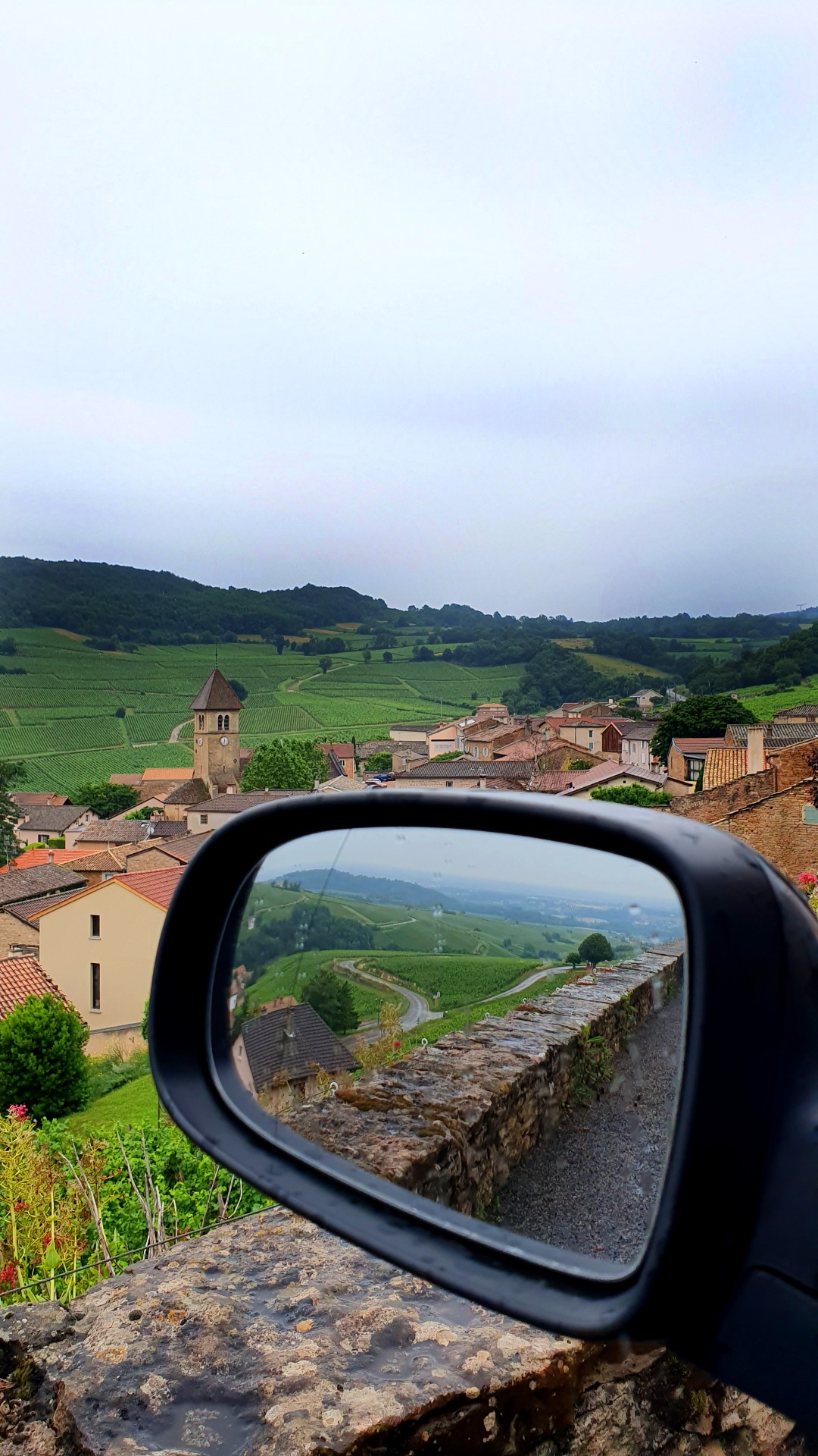 Bien souvent, on recherche la période de l’année idéale ainsi que les conditions météorologiques parfaites pour partir à la découverte d’un nouveau territoire. Et bien ce weekend, le temps est plus que maussade et c’est la pluie qui nous accueille en Saône et Loire. Pour une première on aura, vu mieux… nous n’en ferons pas une formalité et pour cause, la petite route qui nous amène à notre premier arrêt du week-end nous fera vite oublier ces quelques perturbations atmosphériques. Sillonnant dans des vallons, entourée par les vignes, les paysages offert tout au long de cette route sont justes canons ! De champs de vignes en petits villages de pierres, les environs ont vraiment beaucoup de charme. En plus, la pluie s’est calmée pour laisser place à une fine bruine qui vient rafraîchir les feuilles de vigne.