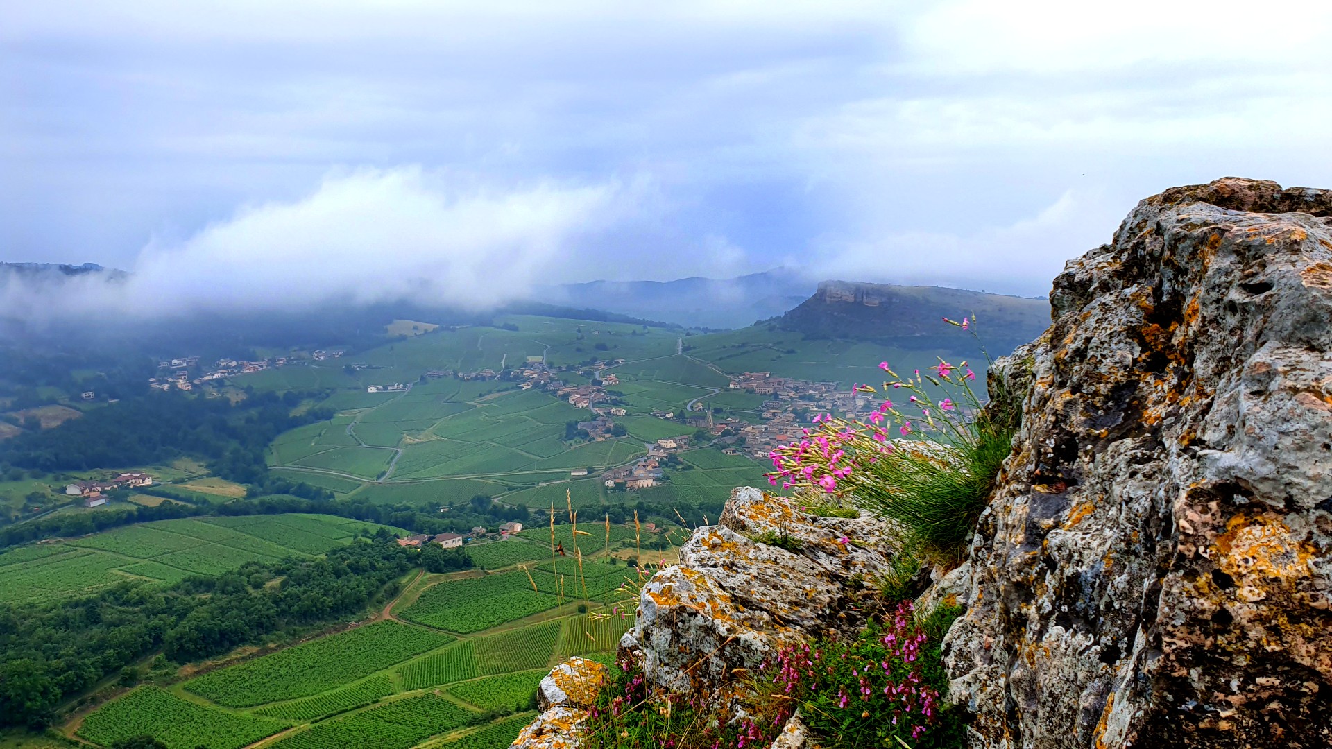 C’est un petit chemin de randonnée très bien balisé qui vous mènera en moins de 45 minutes aller/retour en son sommet. Les mauvaises conditions climatiques ont parfois des avantages. Ce matin nous sommes seules au sommet de la roche et la vue est simplement à couper le souffle ! Vous pourrez de la haut embrasser un panorama exceptionnel sur les vignes du Mâconnais d’un côté, et de l’autre, une vue imprenable sur la Roche de Vergisson arborant une silhouette très similaire à la Roche de Solutré. Lors de votre ascension, vous distinguerez d’ailleurs sur la droite une chemin alternatif pour vous ramener au parking du départ mais aussi un balisage qui vous mènera jusqu’à la Roche de Vergisson. Avis aux amateurs qui veulent découvrir la sœur jumelle !